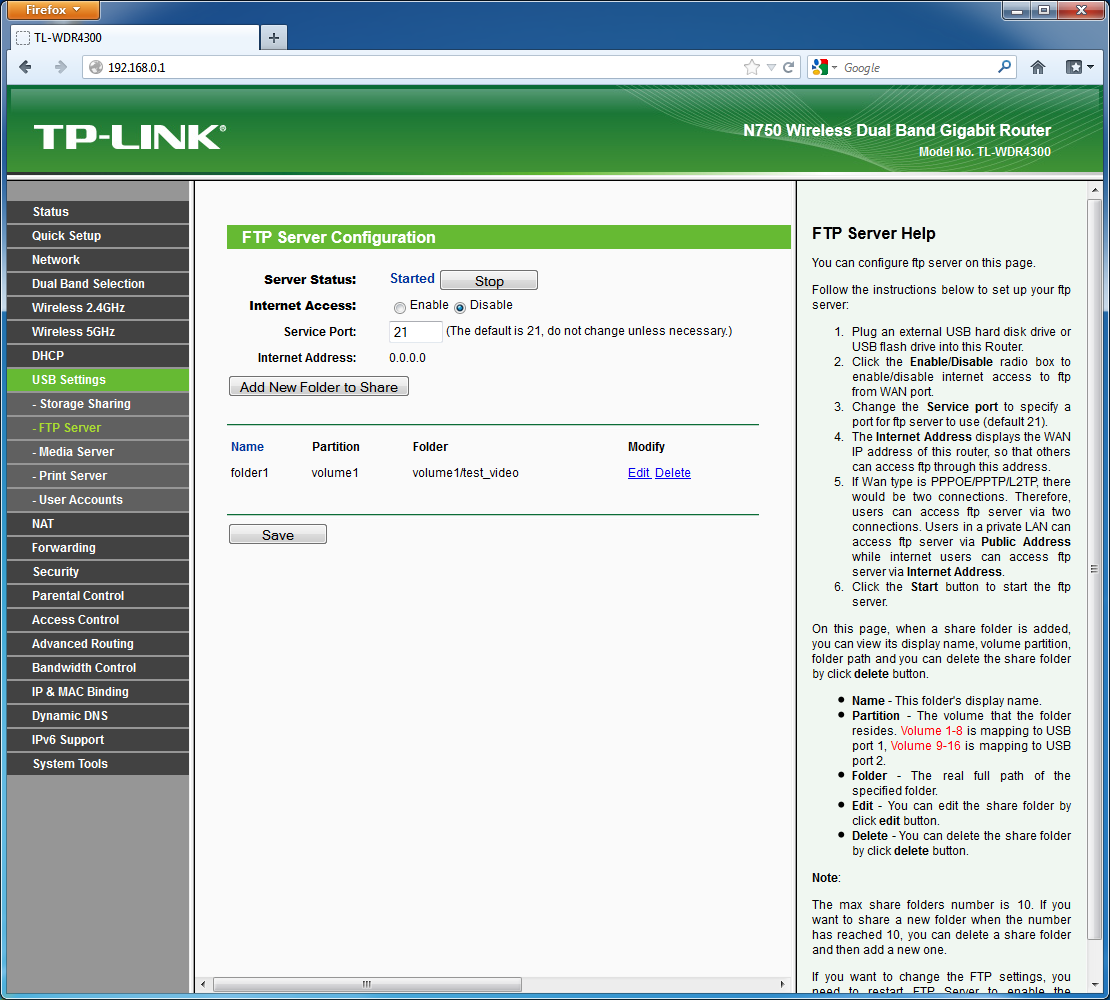 Для FTP все немного интереснее — пользователь сам указывает нужные папки на разделе, которые будут представлены в корне сервера. Можно предоставить доступ и к разделу целиком. Сервер FTP допускает изменение номера основного порта, может быть включен для интерфейса WAN (доступ из интернета), поддерживает пассивный режим и UTF-8 (форсирован). Есть возможность запрограммировать несколько пользователей и установить для каждого права (одновременно ко всем ресурсам) — только чтение или чтение и запись. Также можно запретить пользователю доступ по FTP.