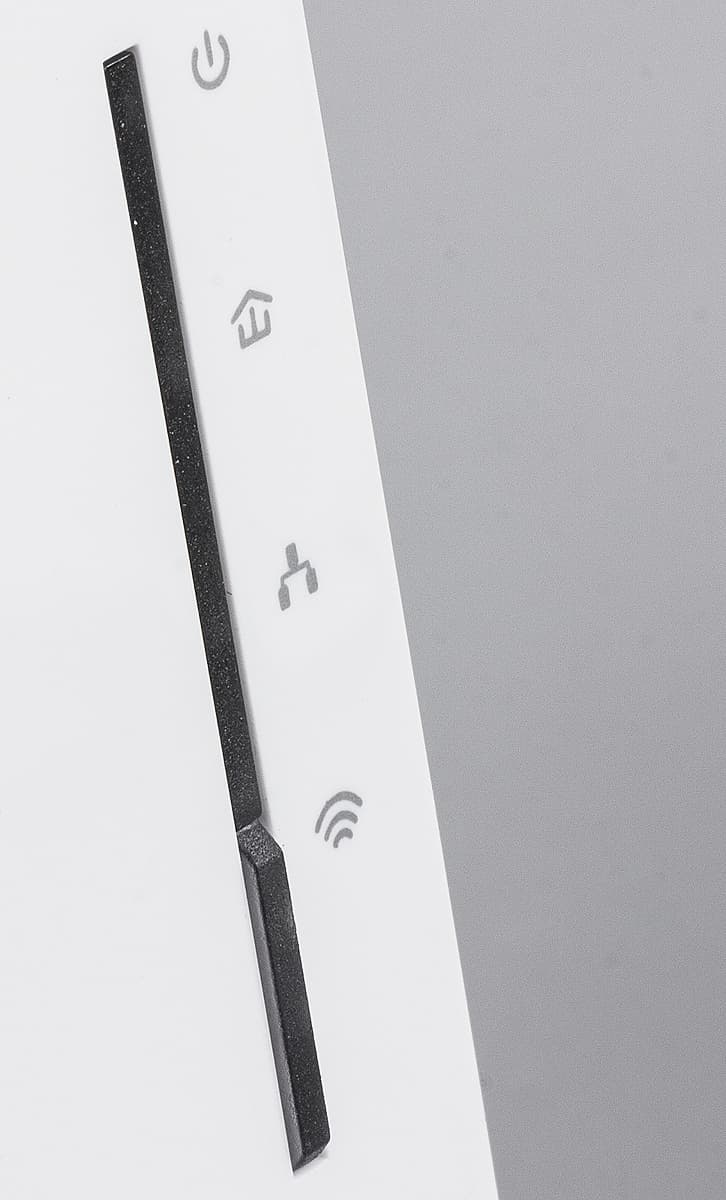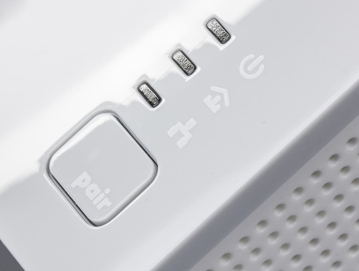 На передней панели присутствуют четыре индикатора — питание, статус сети по электропроводке, статус проводного соединения (один светодиод на два порта), статус беспроводного соединения. Последний индикатор работает также в качестве кнопки для подключения к существующему роутеру по WPS. Заметим, что здесь с проверкой состояния ситуация еще более грустная, поскольку индикаторы имеют общий световод.