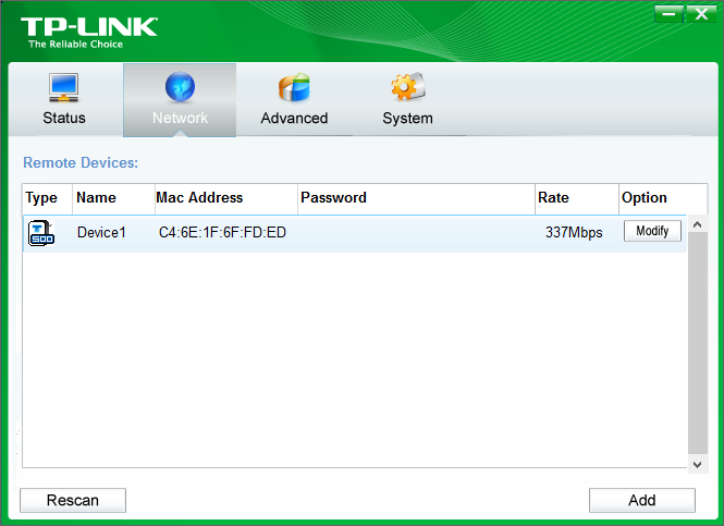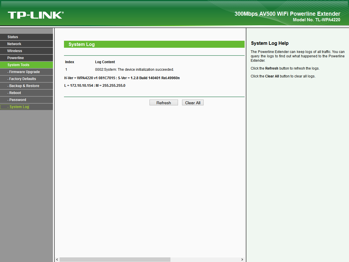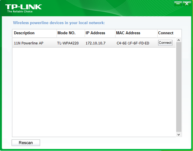 Базовые настройки сети PowerLine для TL-WPA4220 аналогичны TL-PA4010, но у этого устройства есть собственный веб-интерфейс. Найти модель в сети помогает фирменная утилита PowerLine Scan. Но можно и посмотреть журналы роутера и узнать выданный адаптеру по DHCP адрес.