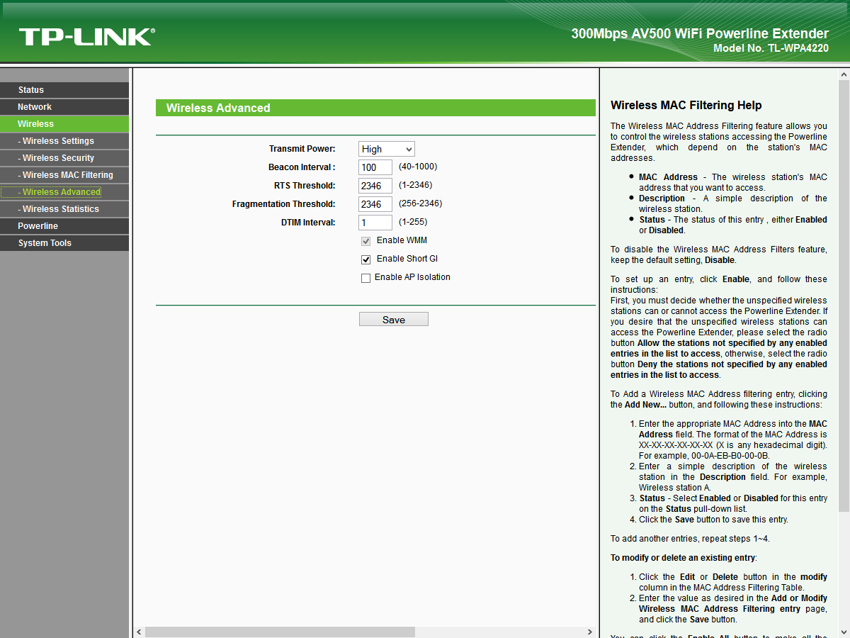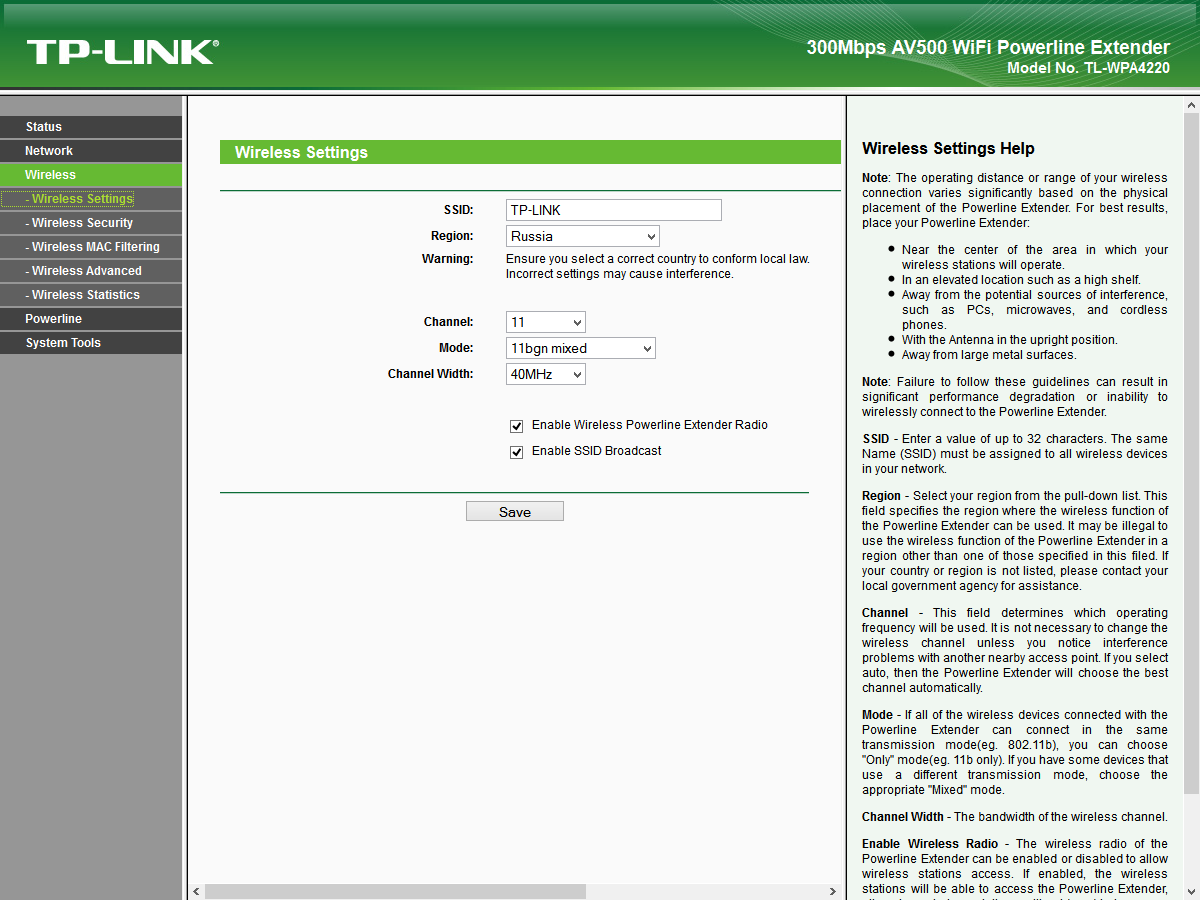 Наиболее интересный раздел — «Wireless». Он имеет аналогичные современным роутерам настройки. Здесь можно изменить название сети, выбрать регион, номер и ширину канала, режим беспроводной сети. Из вариантов защиты поддерживаются открытые сети, WEP, WPA/WPA2 с паролем и сервером RADIUS. Использование WPS возможно только для копирования настроек с существующего роутера. На странице дополнительных опций предусмотрено изменение мощности передатчика (три варианта), включение короткого защитного интервала и режима изоляции клиентов.