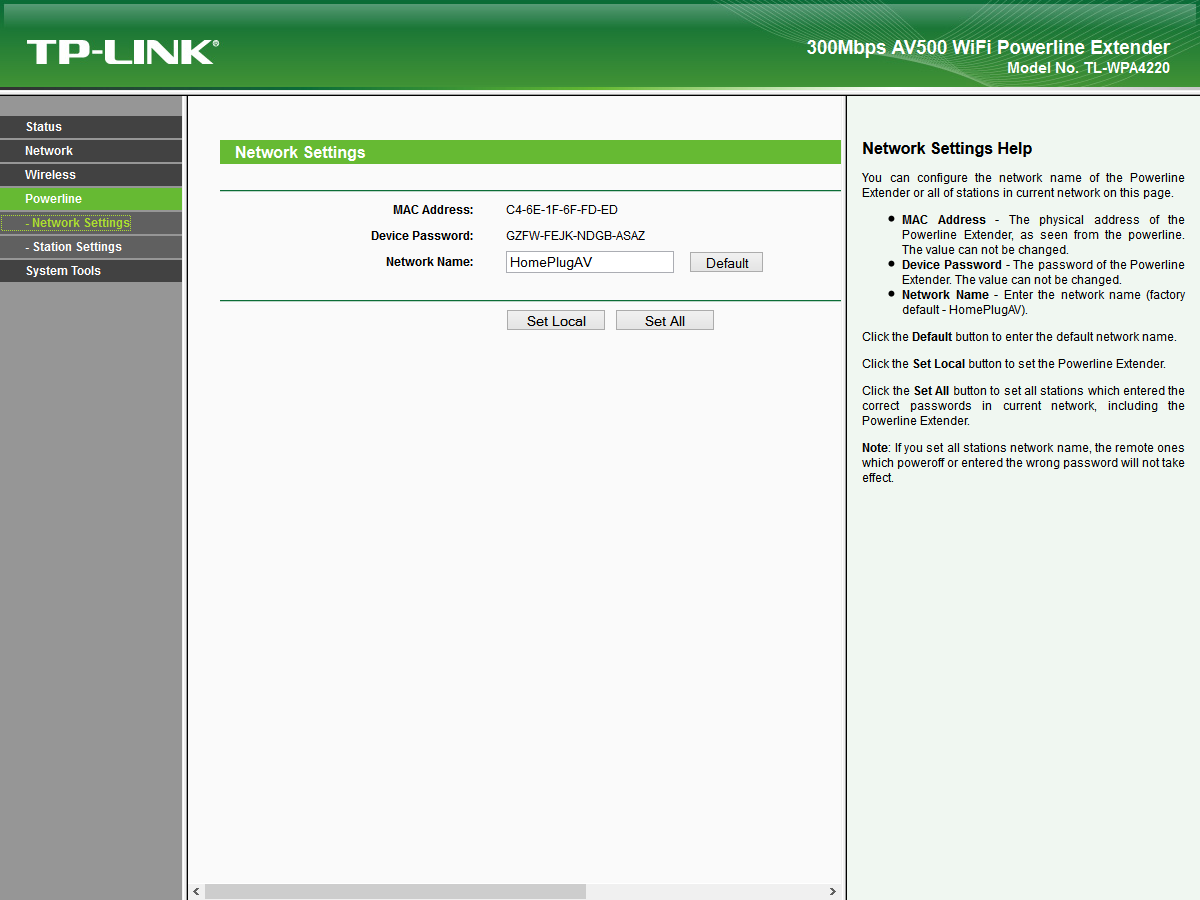 В группе «Powerline» можно изменить имя сети, уточнить пароль данного устройства и посмотреть текущий состав сети по электропроводке.