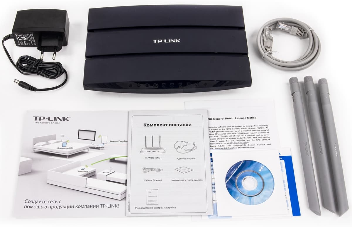 В комплект поставки роутера входит импульсный блок питания с параметрами 12 В 1,5 А, три внешние антенны, сетевой патч-корд, компакт-диск с документацией и утилитами, краткое печатное руководство, гарантийный талон и рекламная листовка.
