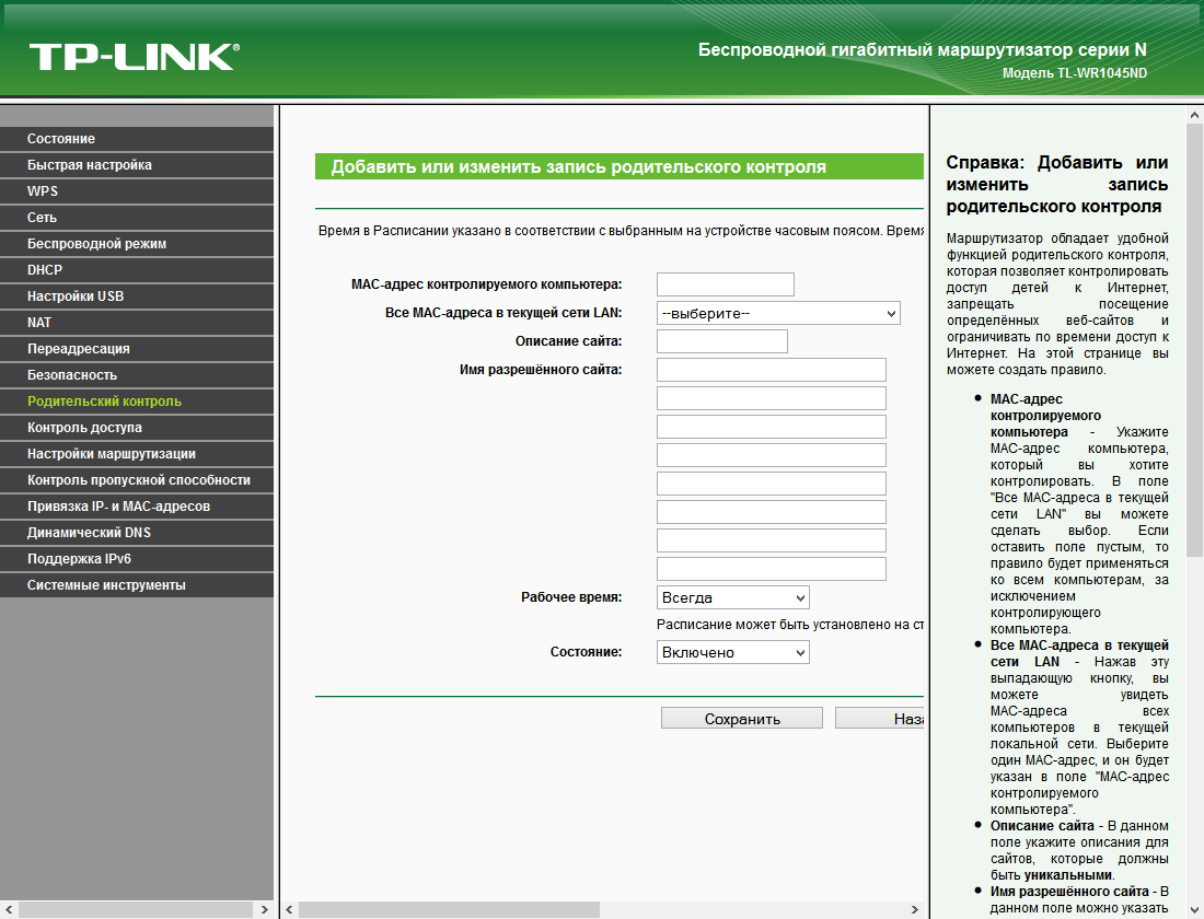 В прошивке реализована функция родительского контроля, позволяющая указать для клиента конкретные имена разрешенных сайтов и расписание, когда с ними можно будет работать.