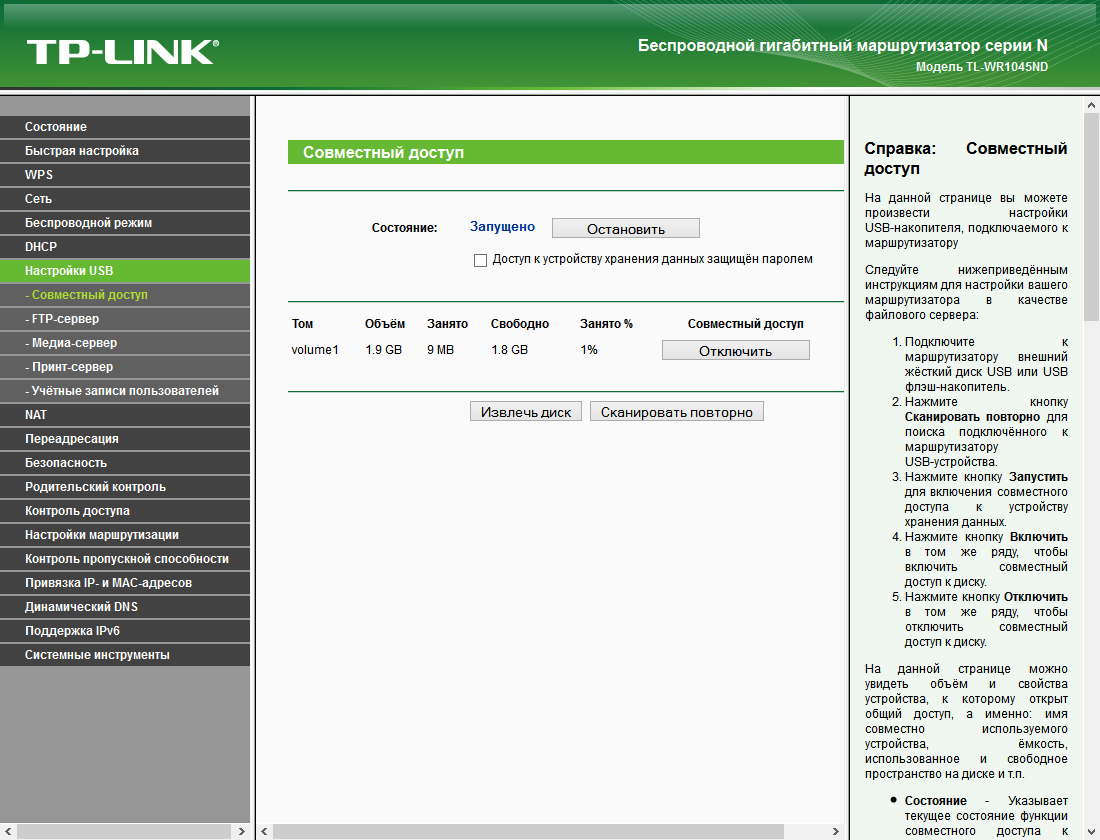 Наличие порта USB позволяет использовать устройство для реализации сетевого хранилища. При этом на подключаемом накопителе можно иметь несколько разделов с файловыми системами FAT32 и NTFS, а вот USB-хабы не поддерживаются. В веб-интерфейсе присутствует специальная кнопка для безопасного отключения накопителей.