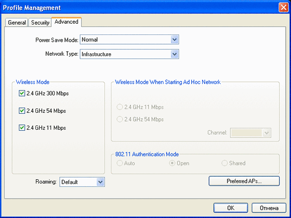 Профиль задает всё необходимое для беспроводного подключения: параметры сети (включая тип — Ad Hoc или Infrastructure), параметры безопасности, доступные режимы (b/g/n) на случай, если точка доступа не поддерживает какой-то из них, а при наличии в сети нескольких точек доступа можно задать для них приоритеты. Но сделать из компьютера с адаптером TP-LINK программную точку доступа утилита не позволяет.