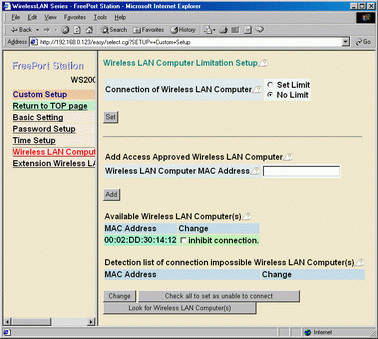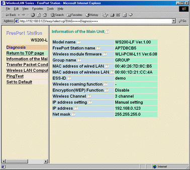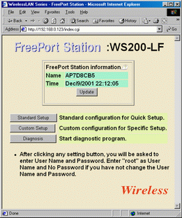 Программа ищет все доступные в локальном сегменте сети точки доступа. Для каждой найденной точки доступа можно посмотреть версии внутреннего ПО и, что самое главное, поменять ее IP адрес, поскольку основное управление ей осуществляется через Web браузер. Доступ к изменению адреса, так же как и дальнейшие настройки, защищены паролем. Можно также настроить устройство на автоматическое получение IP адреса по протоколу DHCP. В дальнейшем вся настройка точки доступа производится через Web браузер, для этого нужно набрать в нем URL типа http://192.168.0.123/cgi-bin/index.cgi или просто два раза щелкнуть мышкой на имени станции в FreePort Station Manager. После этого вы увидите начальное окно настройки: