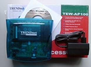 Для связи ПК с радиокартами с существующей проводной сетью Ethernet используется точка доступа TEW-AP100 11Mbps Wireless Access Point. По сути она выполняет функцию моста (bridge) между проводной и беспроводной сетью. Она также выполнена в модном полупрозрачном корпусе: