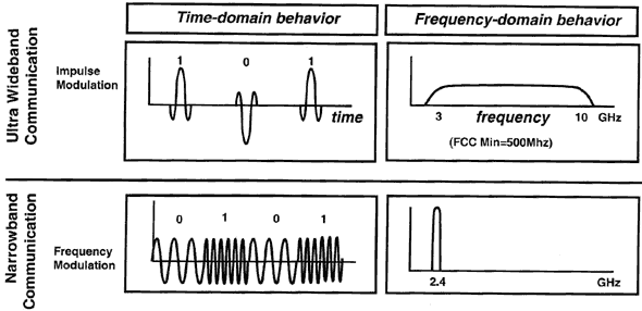 Вверху UWB, внизу традиционная модуляция, в противоположность UWB названная здесь Narrow Band (далее NB). Слева вид сигнала во времени, справа — его частотный спектр — т.е. распределение энергии по полосе частот. Подавляющее большинство современных стандартов передачи данных является NB-стандартами — все они оперируют в пределах достаточно узкой полосы частот, а именно, допуская достаточно небольшие отклонения от так называемой базовой (или несущей) частоты. Например, справа внизу мы видим спектральное распределение энергии обычного передатчика 802.11b. Ему отводится достаточно узкая (ширина одного канала 80 МГц) полоса спектра с опорной частотой 2,4 ГГц. В пределах этой небольшой полосы передатчик излучает существенный объем энергии, необходимой для последующего уверенного приема в пределах расчетного диапазона расстояний (для 802.11b — 100 метров). Сам диапазон строго определяется FCC и иными регулирующими государственными комиссиями и, разумеется, требует лицензирования. Данные кодируются и передаются путем частотной модуляции (управления отклонением от базовой частоты) в пределах уже описанного канала.