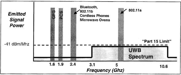Теперь давайте посмотрим на UWB — здесь традиционный подход поставлен с ног на голову. Во временном пространстве передатчик излучает короткие импульсы специальной формы, подобранной так, чтобы равномерно размазать всю энергию импульса по заданному достаточно широкому участку спектра (приблизительно от 3 ГГц до 10 ГГц). Данные, в свою очередь, кодируются полярностью и взаимным расположением импульсов. В результате, обладая достаточно высокой суммарной передаваемой в эфир мощностью и, следовательно, значительным расстоянием уверенного приема, UWB сигнал в каждой конкретной точке спектра (т.е. на каждой конкретной лицензируемой полосе частот) не превышает крайне низкого, во много раз меньше, чем у NB-сигналов, значения. В результате, согласно соответствующему правилу FCC, такой сигнал становится допустимым к использованию, несмотря на то, что он занимает, в том числе, и уже отведенные для других применений участки спектра: