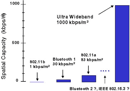 Итак, нам удалось захватить существенную полосу спектра, не нарушив существующих правил. Суммарная энергия передатчика, которую мы можем вложить в эту полосу, определяется площадью спектральной характеристики (см. закрашенные зоны на предыдущей схеме). Даже невооруженным глазом видно, что в случае UWB она существенно выше традиционных NB-сигналов, таких как 802.11b или 802.11a. Соответственно, в случае UWB мы можем либо передавать данные на большее расстояние, либо передавать больше данных, особенно, когда в эфире совместно работает множество близко расположенных устройств. Давайте посмотрим на диаграмму с расчетной предельной плотностью передаваемых данных на квадратный метр: