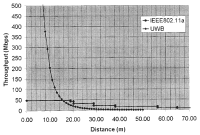 Если в случае традиционного NB-стандарта 802.11a имеется искусственно созданная зависимость пропускной полосы от расстояния (фиксированный набор пропускных полос, дискретно переключаемых по мере увеличения расстояния), то UWB реализует эту зависимость куда как более естественно. На коротких расстояниях его пропускная полоса взлетает в заоблачные дали, делая вполне оправданными даже наши мечты о межчиповой коммуникации, однако на существенных расстояниях, вопреки нашим ожиданиям, UWB проигрывает NB-стандарту. В чем дело? С одной стороны, теоретический объем передаваемой энергии, а, следовательно, и предельный объем передаваемой информации, выше. С другой стороны, не будем забывать, что в реальной жизни информация всегда передается с избытком. Кроме энергетического объема играют роль конструктивные особенности. Например, характер модуляции, а точнее то, насколько устойчиво и с какими потерями она принимается и детектируется приемником. Давайте сравним классический: