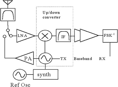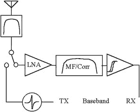 Классический трансивер (приемопередатчик по-нашему) содержит генератор опорной частоты (synth), как правило, стабилизированный неким референсным кварцевым элементом (Ref Osc). Далее, в случае приема эта частота вычитается из принятого сигнала, в случае передачи — модулируется (складывается) с передаваемыми данными. В случае UWB схема передатчика проста до невозможности — мы просто формируем импульс необходимой формы и отправляем его на антенну. В случае приема — мы усиливаем сигнал, применяем полосный фильтр, выделяющий нашу рабочую зону спектра, и вновь на этом все заканчивается — мы получаем готовый импульс. Вся тонкость в том, как его распознать! Здесь и лежит ключ к увеличению эффективного расстояния UWB. Разумеется, распознать одиночный импульс существенно труднее, чем серию колебаний несущей частоты. Итак, для триумфального шествия UWB необходимо создать не только ключи (генераторы импульсов) строго определенной формы, переключающиеся с характерными промежутками порядка 3 ГГц, но и разработать качественные детекторы этих импульсов, что на порядок сложнее. Как бы там ни было, конструктивно UWB существенно проще NB-трансиверов, и может быть полностью реализован на чипе. А самое главное, UWB-передатчик вообще не требует какой-либо аналоговой обвязки — сигнал может уходить в эфир что называется «прямо с чипа», а в случае приемника эта обвязка также минимизирована и, что самое главное, может быть реализована в рамках не только гибридных, но и базовых технологий, т.е. CMOS и ее приемников.