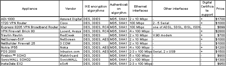 Приложение — сводная таблица характеристик шлюзов VPN класса SOHO.
