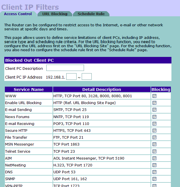 Да, в правилах есть возможность учета времени суток (что умеют далеко не все маршрутизаторы). Но зато возможности по заданию самого правила очень ограничены. Во-первых, можно фильтровать только по исходящему из LAN IP-адресу, то есть, основываясь на адресе клиентской машины. Во вторых — в правиле можно учитывать только порт назначения (протоколов tcp/udp). И в принципе, больше ничего. Правда, еще есть возможность контекстной фильтрации веб-трафика по url/ключевым словам. Но это уже не совсем файрвол.