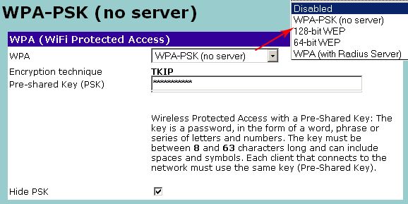 | WPA-PSK (pre-shared key) | TKIP only | |||