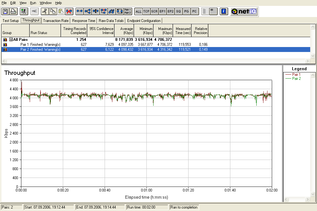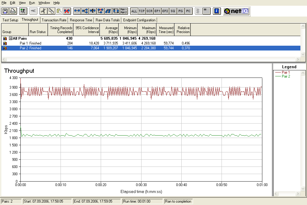 Зададим одному потоку трафика ширину канала 4096 кбит/с, а второму — 2048 кбит/с. Посмотрим на график распределения скоростей.