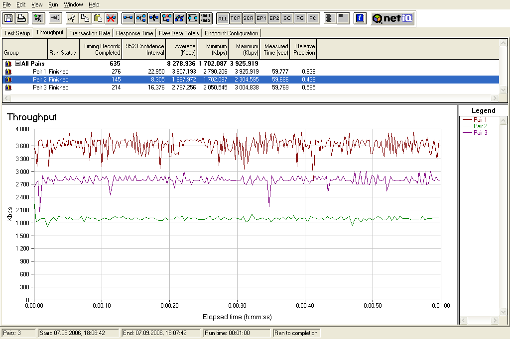 Как видно из графика, между тремя потоками скорость распределяется в зависимости от заданной ширины полосы пропускания канала. Скорости в потоках соответствуют тем, что были получены в первом тесте, где гонялся только один поток трафика.
