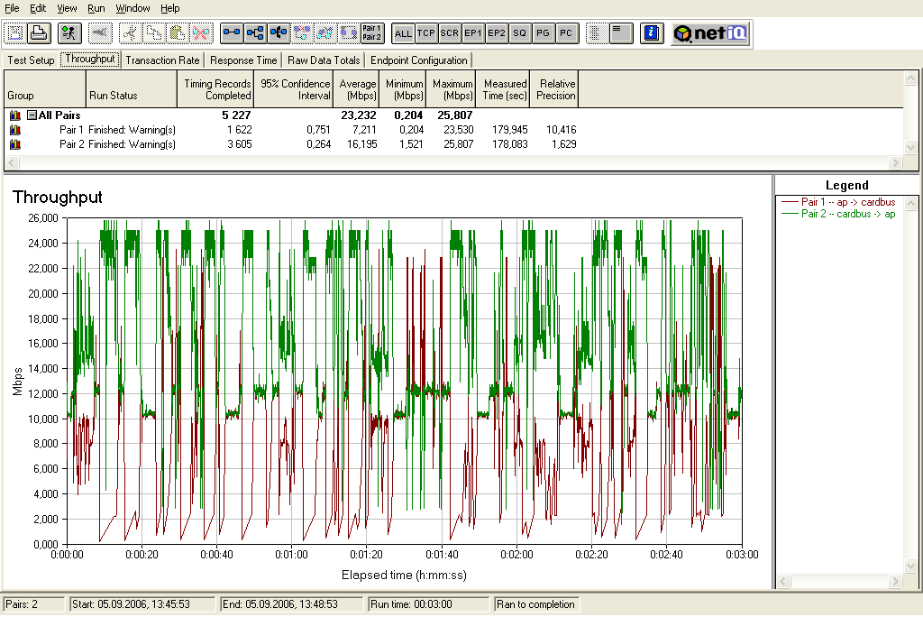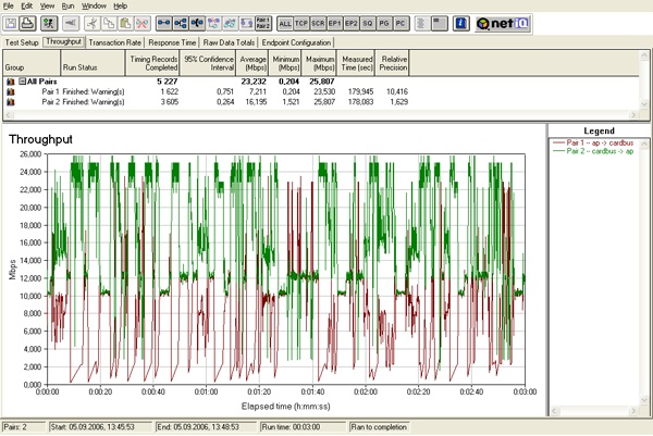 Тест "Беспроводной Cardbus-адаптер — точка доступа на интернет-центре ZyXEL P-660HTW" — трафик гоняется между беспроводным Cardbus-адаптером ZyXEL G-162 и компьютером, находящимся в LAN-сегменте точки доступа на интернет-центре ZyXEL P-660HTW. Расстояние между беспроводным адаптером и точкой доступа не превышает 5-ти метров.