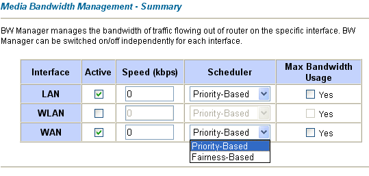 Здесь задаются параметры интерфейсов. Правила шейпинга применяются к трафику, исходящему с соответствующих интерфейсов. То есть, задавая параметры шейпинга на LAN-интерфейсе, мы работаем с трафиком, приходящим в сегмент LAN (то есть с входящим трафиком). Для работы шейпинга необходимо задать скорость интерфейса (в кбит/с). Параметр «Max Bandwidth Usage», говорит устройству, чтобы оно использовало всю доступную ширину полосы пропускания канала. Параметр «Scheduler» задает тип распределения трафика между потоками: трафик может распределяться в зависимости от установленных приоритетов либо «по справедливости» — то есть так, чтобы один или несколько каналов с более высоким приоритетом не использовали всю доступную ширину полосы пропускания канала — при этом считается, что все подклассы имеют одинаковый приоритет.