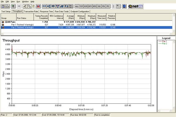 Опытным путем было обнаружено, что для тестирования ADSL-оборудования методика тестирования должна быть несколько изменена. В частности, оказалось, что результаты тестирования в значительной мере отличаются при изменении параметров скрипта, используемого в NetIQ Chariot. Размер передаваемого файла был увеличен в 10 раз и теперь составляет 1 000 000 (1 млн. байт) — это гарантирует, что размер большинства передаваемых пакетов будет максимальным. При ранее используемом значении (100 000 байт) получались более низкие результаты. Для наглядности в данном тестировании мы произведем замеры как при старом значении параметра «file size» (100 000 байт), так и при новом (1 000 000). Впоследствии данные изменения будут внесены в методику тестирования маршрутизаторов.