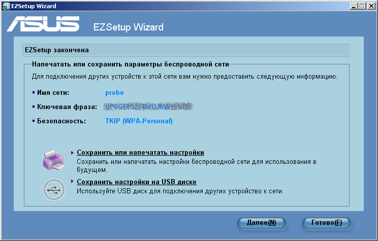 Данные настройки отображаются во втором окне (см. Рис.45) диалога. Ниже можно видеть две дополнительные опции: сохранить/распечатать текстовый файл с настройками беспроводного соединения или использовать USB диск.