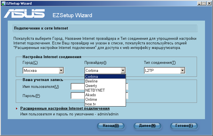 При выборе кнопки Далее программа переходит к окну выбора настроек типа Интернет-соединения. Производитель предусмотрел настройки основных провайдеров для 44 городов России. Опция Расширенные настройки Internet подключения вызывает окно доступа к Web интерфейсу роутера. После принятия настроек утилита информирует пользователя о перезагрузке устройства для принятия выбранных настроек.