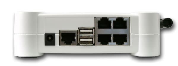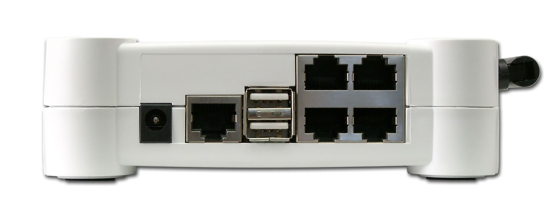 Маршрутизатор с точкой доступа стандарта IEEE 802.11g, 4-хпортовый коммутатор 10/100 Мбит/с, принт-сервер, файл-сервер.