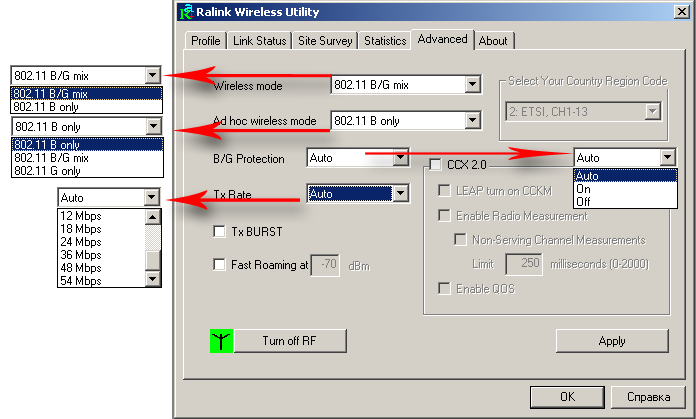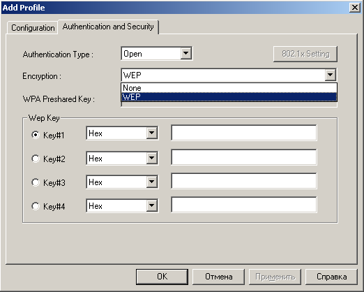 Утилита настройки поддерживает множество различных видов WPA-шифрования. Несмотря на то, что при установке был указан регион "Восточная Европа/Россия", количество каналов ограничено 11-ю.