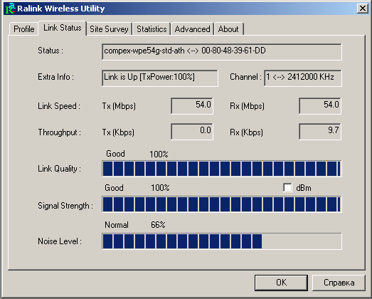 Конфигурирование устройства осуществляется с помощью утилиты настройки, которая полностью аналогична утилите настройки PCI-адаптера WLP54G, рассмотренного чуть выше.