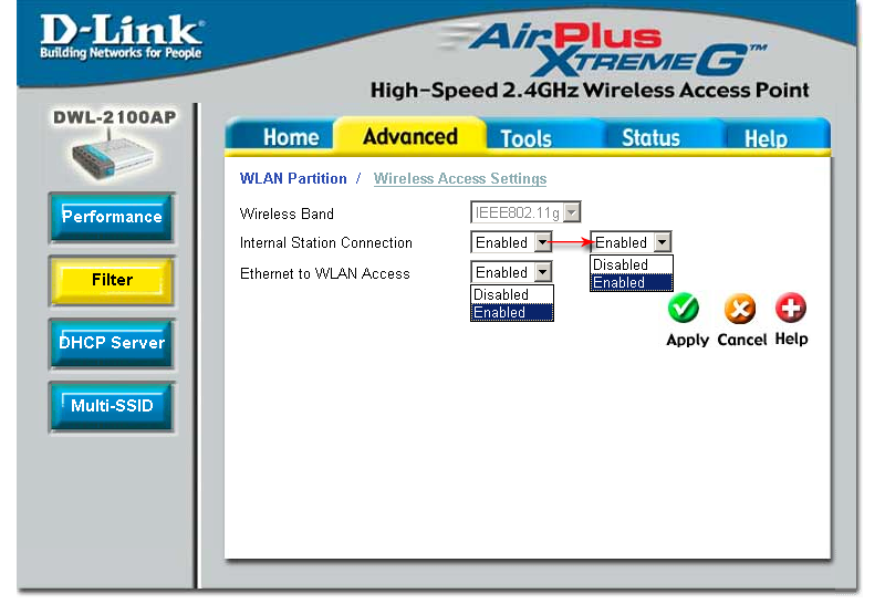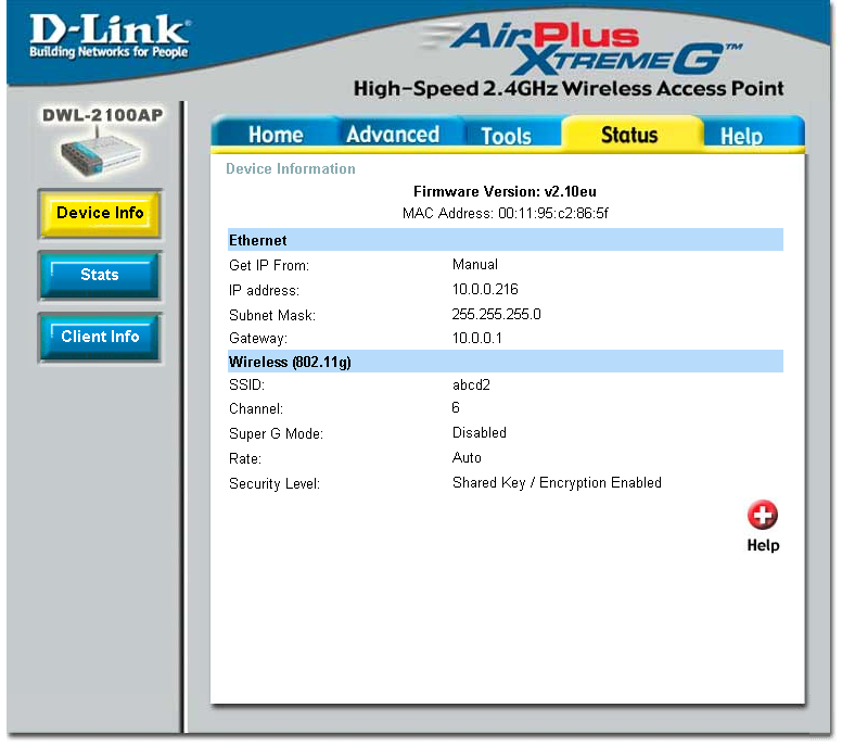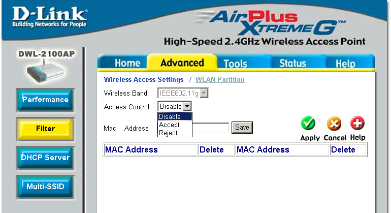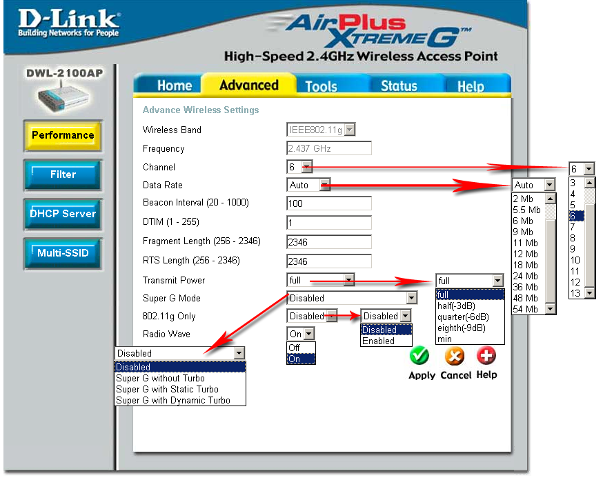 Точка доступа D-Link DWL-2100AP показывает высокие результаты как в режиме 802.11g, так и в режиме Super G и Super G with Turbo — в большинстве случаев они дают значительный прирост производительности, но в ряде случаев при их использовании производительность падает. В случае использования режима AdHoc включение Super G режима значительно снижает производительность, несмотря на то, что скорость соединения составляет 54 Мбит/с (против скорости 11 Мбит/с, которая устанавливается в режиме 802.11g). Режим связи 802.11b нельзя включить посредством WEB-интерфейса — его можно выбрать, только настраивая точку доступа по Telnet.Плюсы:
