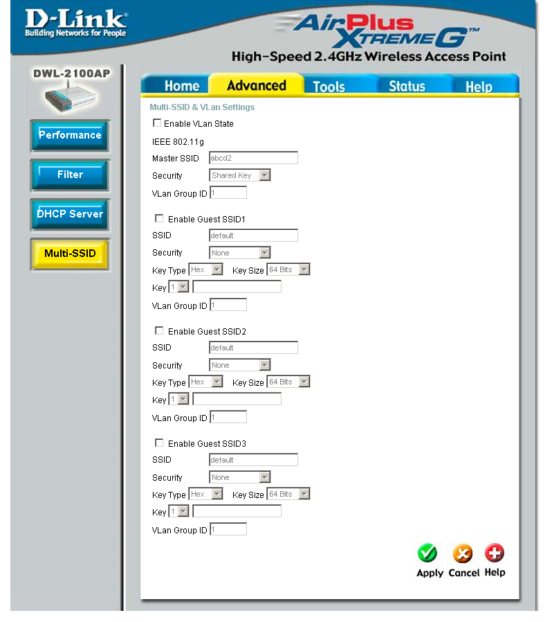 Устройство поддерживает функцию работы с виртуальными локальными сетями. Виртуальные локальные сети создаются из соображений безопасности, чтобы, например, компьютеры беспроводного сегмента имели доступ в Интернет, но не имели доступа друг к другу. Устройство также поддерживает работу с устройствами LAN-сегмента, поддерживающими стандарт виртуальных локальных сетей IEEE 802.1Q. Все клиенты, подключенные к точке доступа можно разделить на 4 виртуальные группы, создав при этом 4 SSID-идентификатора, а каждой группе можно задать свои параметры безопасности.