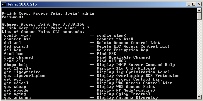 Точку доступа также можно настроить по протоколу Telnet — он имеет очень много команд, которые идут в одном большом списке и не разделены на вложенные группы