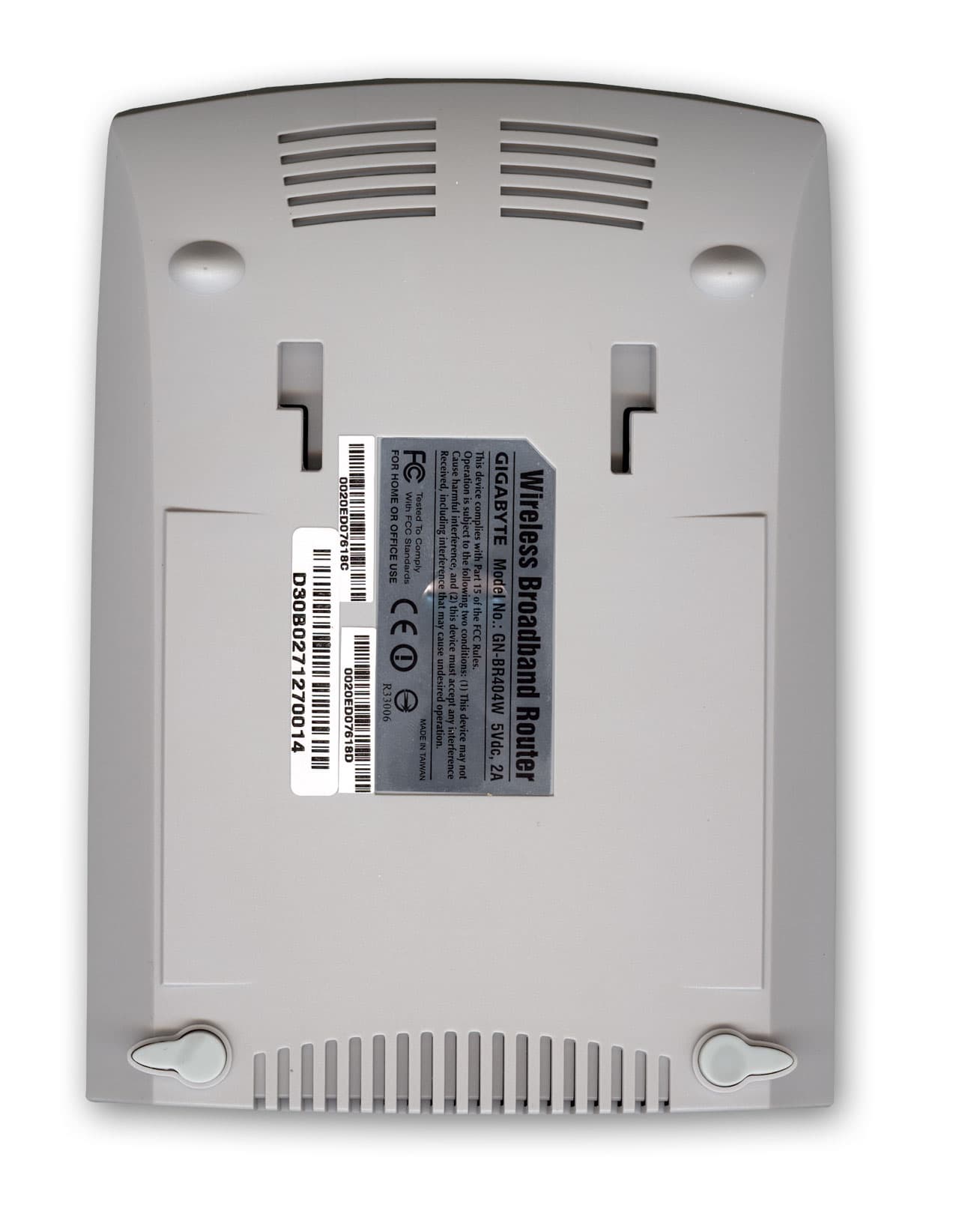 Снизу роутера расположены ножки для горизонтальной установки, а так же два отверстия крепления подставки, которая позволяет установить BR404W вертикально. Кстати, эти же отверстия можно использовать для закрепления (подвеса) устройства на стене.