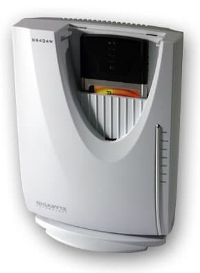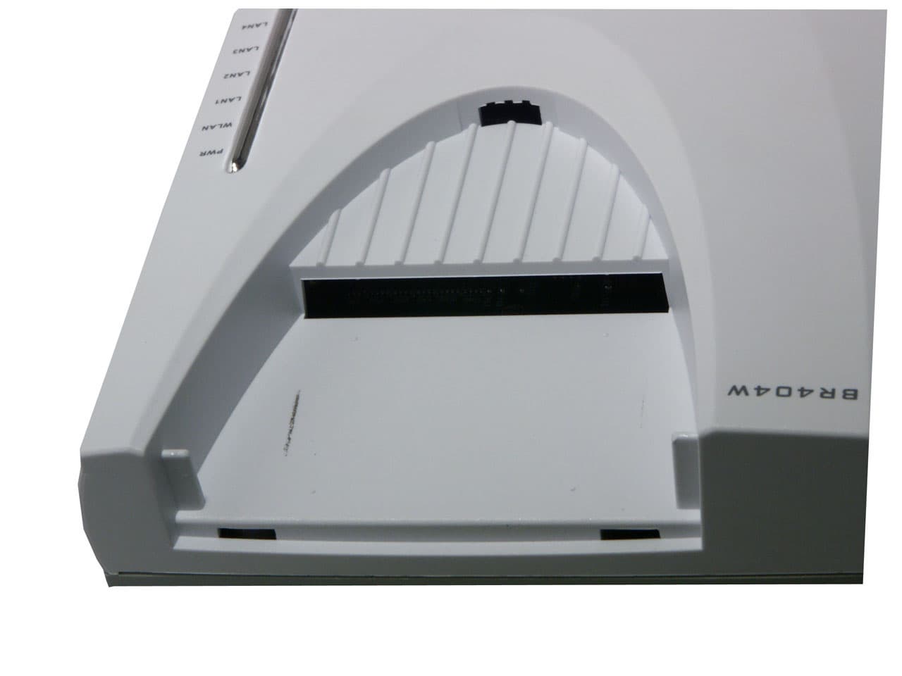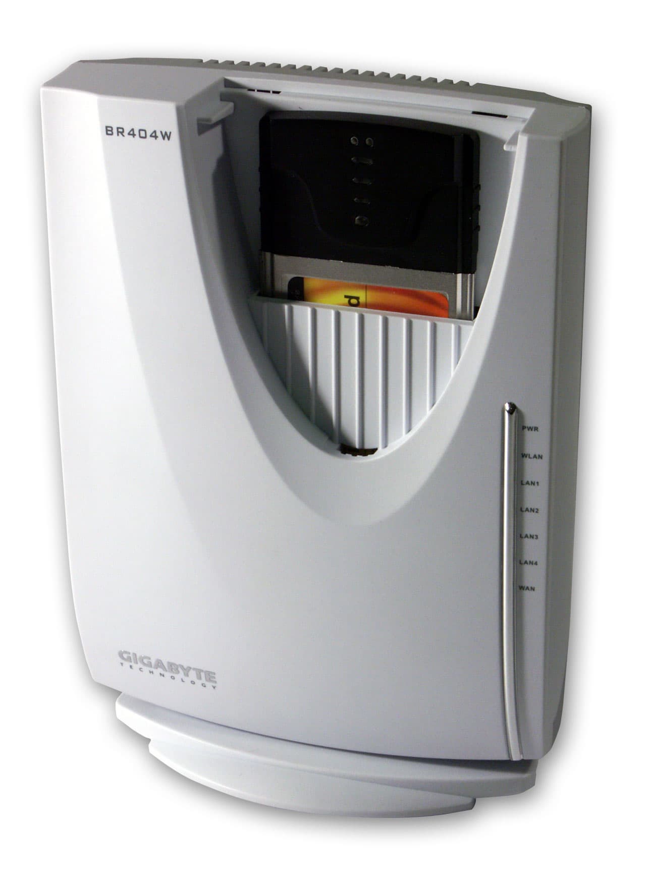 Во втором случае устройство ставится на специальную подставку (прикрепляющуюся к корпусу), позволяющую ему устойчиво стоять в вертикальном положении. Кстати, под крышкой овального вида скрывается 802.11g pcmci карта, которая и наделяет BR404W беспроводными возможностями. Если ее вынуть, устройство лишится свойств беспроводной точки доступа, зато саму карту можно использовать, например, в ноутбуке.