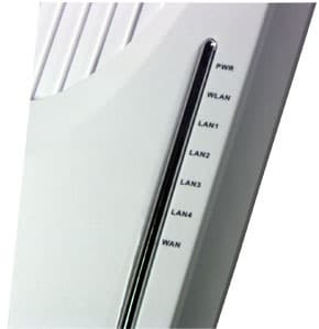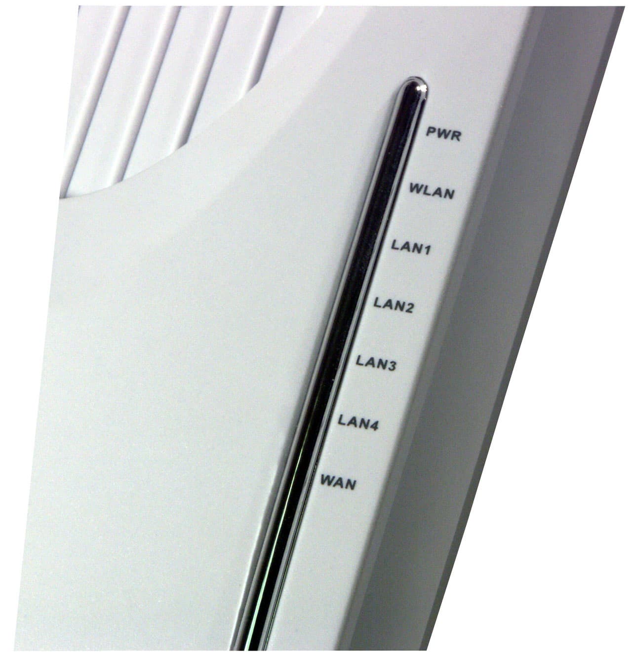 На передней панели роутера расположены 7 индикаторов. Все они скрыты за полоской серебристого цвета, которая на самом деле оказывается практически прозрачной, стоит включиться индикатору, которой находится под этой полоской. Одноцветные (зеленые) индикаторы LAN1-LAN4 и WAN показывают наличие сетевого соединение к соответствующему порту и передачу данных через него. Индикатор WLAN (зеленый, одноцветный) — наличие подключенной к роутеру беспроводной карты, а так же передачу данных в беспроводном сегменте. А последний индикатор PWR является двуцветным, зеленым цветом он сигнализирует о наличии питания, красным — о неисправности устройства.