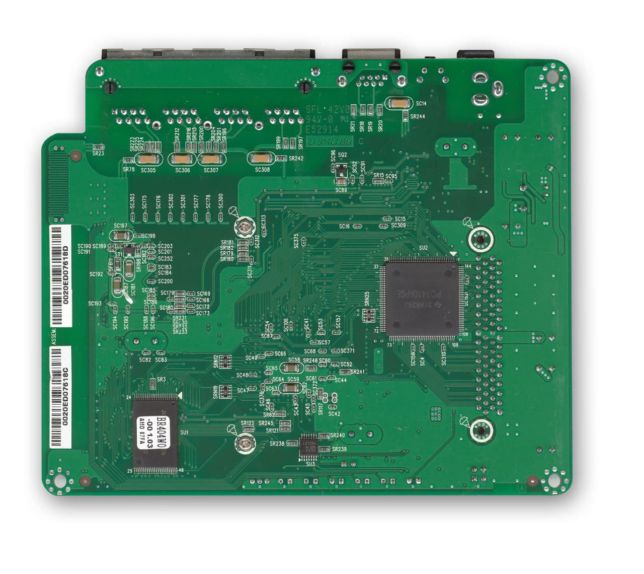 На обратной стороне печатной платы расположены только микросхема флэш-памяти и PCI-to-PC card контроллер. Последний отвечает за сопряжение внешних PCMCIA карт с основной платой роутера. Вся остальная электроника находится на лицевой стороне.