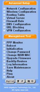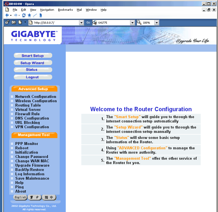 Традиционно, устройство конфигурируется посредством WEB-интерфейса. При первом запуске достаточно установить на сетевой плате автоматическое получение IP-адреса, подключить компьютер к GN-BR404W в LAN порт (роутер выдаст IP адрес из диапазона 192.168.1.xxx) и набрать в браузере http://192.168.1.254, где и находится интерфейс конфигурирования.