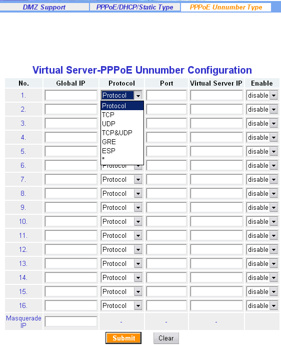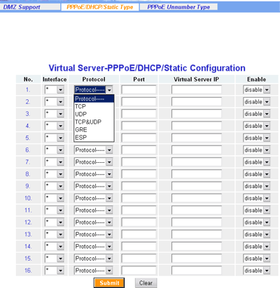 В разделе Virtual Server, можно задать один DMZ хост, а так же настроить редирект портов (т.е. настроить виртуальные сервера) для всех поддерживаемых типов сессий.