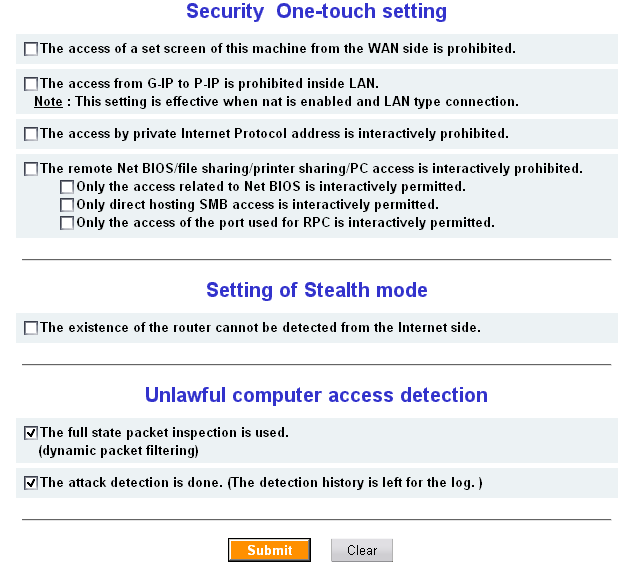 Раздел Firewall Rule, на мой взгляд, является одним из наиболее интересных в роутере. В первом подразделе настраиваются глобальные элементы защиты, такие, как запрет конфигурирования роутера со стороны WAN, запрет ответов на ICMP ping, протоколов Netbios, и тд. Тут же активируется SPI составляющая файрвола и включение логирования атак на WAN интерфейсе.
