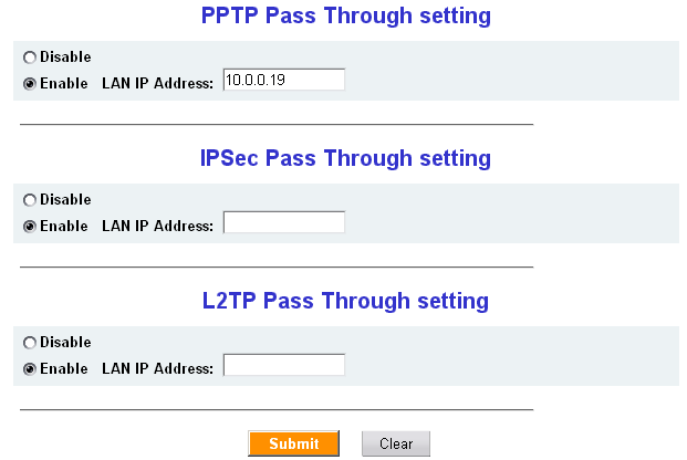 Следующий подраздел позволяет разрешить VPN pass-through для PPTP, L2TP и IPSec протоколов, к сожалению, возможно задание только одного IP для каждого из протоколов.