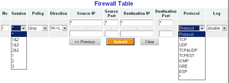 Последний подраздел позволяет настроить статические правила встроенного файрвола. Приятно то, что в каждом правиле возможно задание номера сессии, для которой правило будет действовать, направление пакета (WAN to LAN или LAN to WAN), тип протокола (из предопределенного, но довольно большого списка). Кстати, в типах протокола можно задать тип TCPEST (TCP Established — пакет, относящийся к уже установленной сессии — достоинство SPI расширения файрвола). Кроме того, для каждого правила задается src/dst ip/port. Плюс, для каждого правила можно включить логирование. В общем, встроенный файрволл довольно приятен в настройке и гибок.