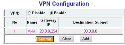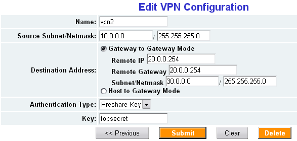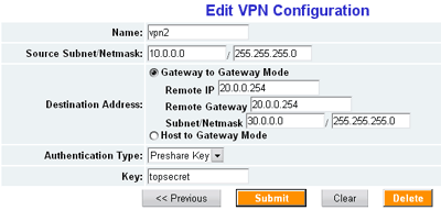 Поддерживается только 3DES шифрование (Auth — HMAC/MD5). Возможна работа как в режиме туннеля до удаленной сети, так и туннеля до хоста. В качестве ключа шифрования возможно использование лишь preshare-key.