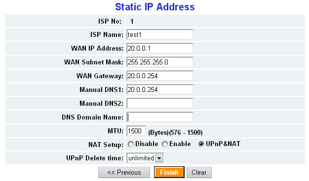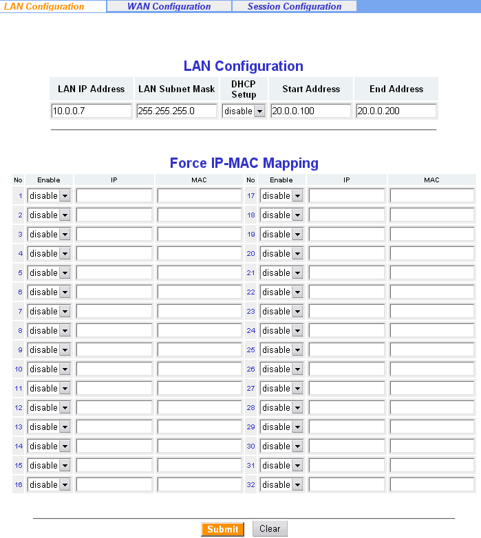 В разделе Network Configuration конфигурируются LAN и WAN интерфейсы, а так же настраивается встроенный DHCP сервер. В DHCP сервере можно принудительно ассоциировать MAC адреса с IP адресами (до 32 записей).