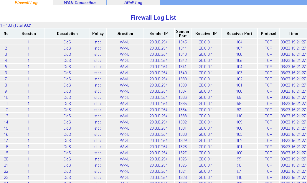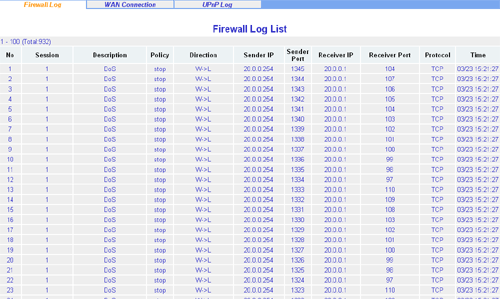 Раздел Log Information позволяет увидеть события, сохраненные во внутреннем логе устройства. К примеру, атаки или прохождения пакетов по заранее заданным правилам в файрволе. К сожалению, устройство не может сохранять логи где-нибудь на внешнем сервере логов. А логи внутри устройства сохраняются лишь до перезагрузки устройства.