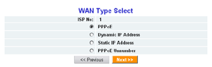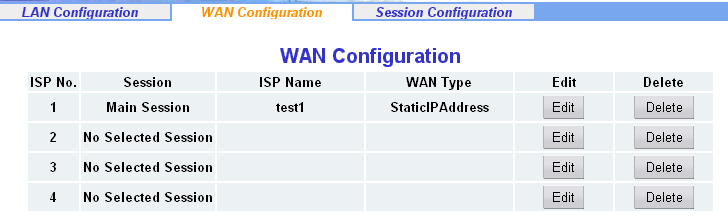 В подразделе WAN Configuration настраивается WAN интерфейс. Тут можно задать до 4 различных типов-сессий, которые будут работать на этом интерфейсе.