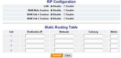 В секция Routing Table настраивается роутинг (и поддержка RIP протоколов), причем последнее можно задать для каждой из четырех сессий отдельно.