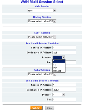 Последняя подсекция наиболее интересна. Тут надо задать, какая из сессий (заданных в предыдущем экране) будет использоваться маршрутизатором. Т.е., если не задать не одну из существующих, данные никуда уходить не будут. Как видно из скриншота, часть трафика можно отправить в Sub-Session1 (возможна фильтрация его направления по портам/протоколам), часть — в Sub-Session2. Остальной трафик пойдет по каналу Main Session (или по Backup, в случае падения основного канала).