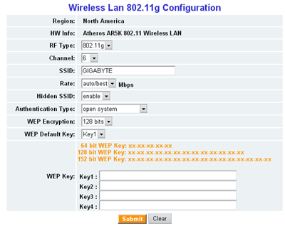 Далее идет раздел Wireless Configuration. Здесь настраивается все связанное с беспроводным сегментом. В первом подразделе, кроме стандартных, стоит отметить функцию 156-битного шифрования, правда она не является стандартной и следовательно, нет гарантии, что заработает в паре с другим устройством (тоже поддерживающим эту функцию) производства не Gigabyte.