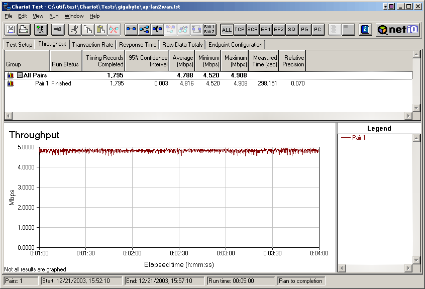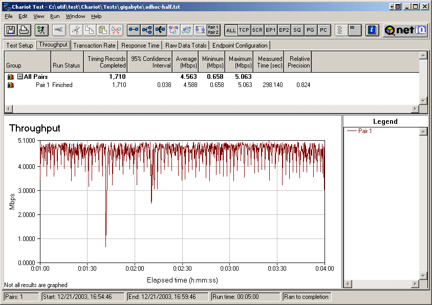В данном случае было установлено два сенсора. Один находился на компьютере с установленным на нем объектом тестирования (GN-WLBZ201), другой — на хосте, подключенном к локальному (проводному) порту точки доступа или с установленным беспроводным адаптером WL-130 (в зависимости от характера теста — Infrastructure или Adhoc). В качестве шаблона генерации использовался шаблон Throughput с жестко заданным временем работы (300 секунд).