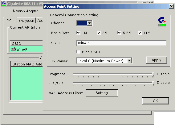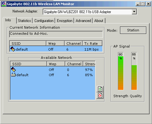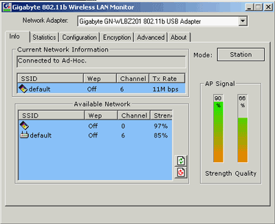 Внешний вид интерфейса драйвера и его настройка не отличается от описанной в статье «Точка доступа GN-A16B и USB-адаптер GN-WBZB-M», со всеми описанными в той статье плюсами и минусами.